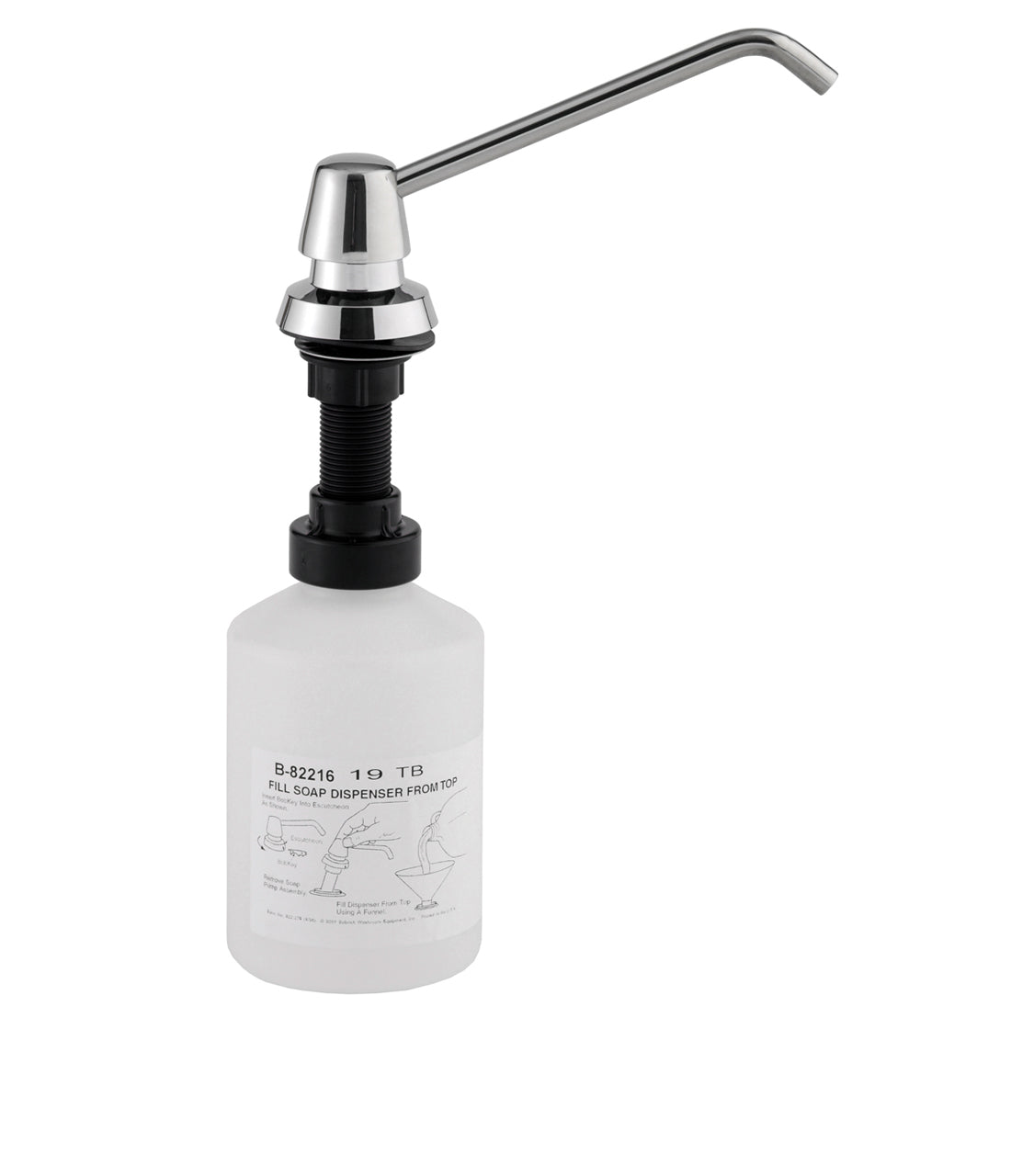 The Bobrick B-82216 is a liquid, manual 20-fl oz hand soap dispenser that is corrosion-resistant and has a vandal-resistant locking cover and free-turning spout. The body and shank are high-impact-resistant ABS plastic with a shatter-resistant polyethylene container. It has a bright polished finish.